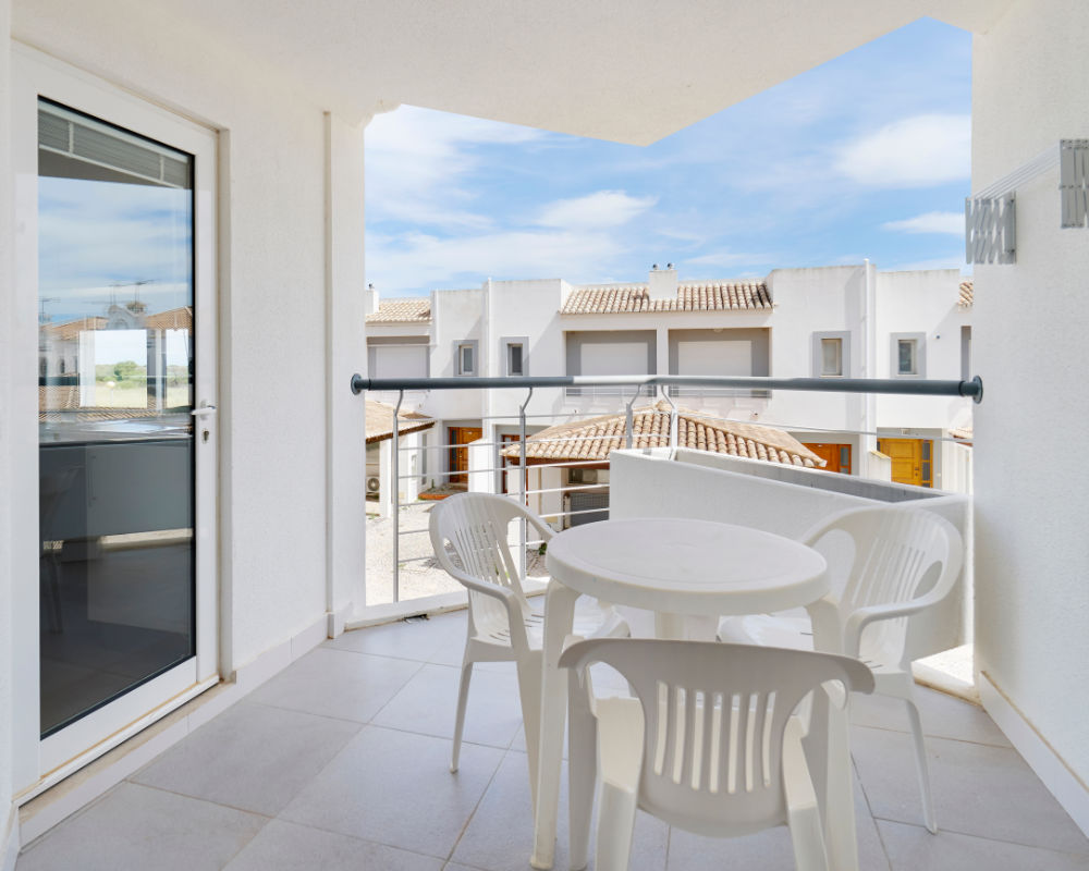 - varanda com mesa, cadeiras e estendal.